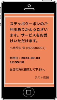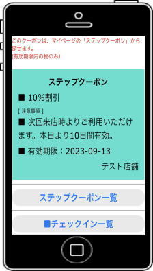 ステップクーポン お店でチェックイン処理を行ったお客様だけに発行される特別な次回来店時に使えるクーポン! チェックイン完了すると、下記の画面が表示されます。「クーポンを発行する」を押します。